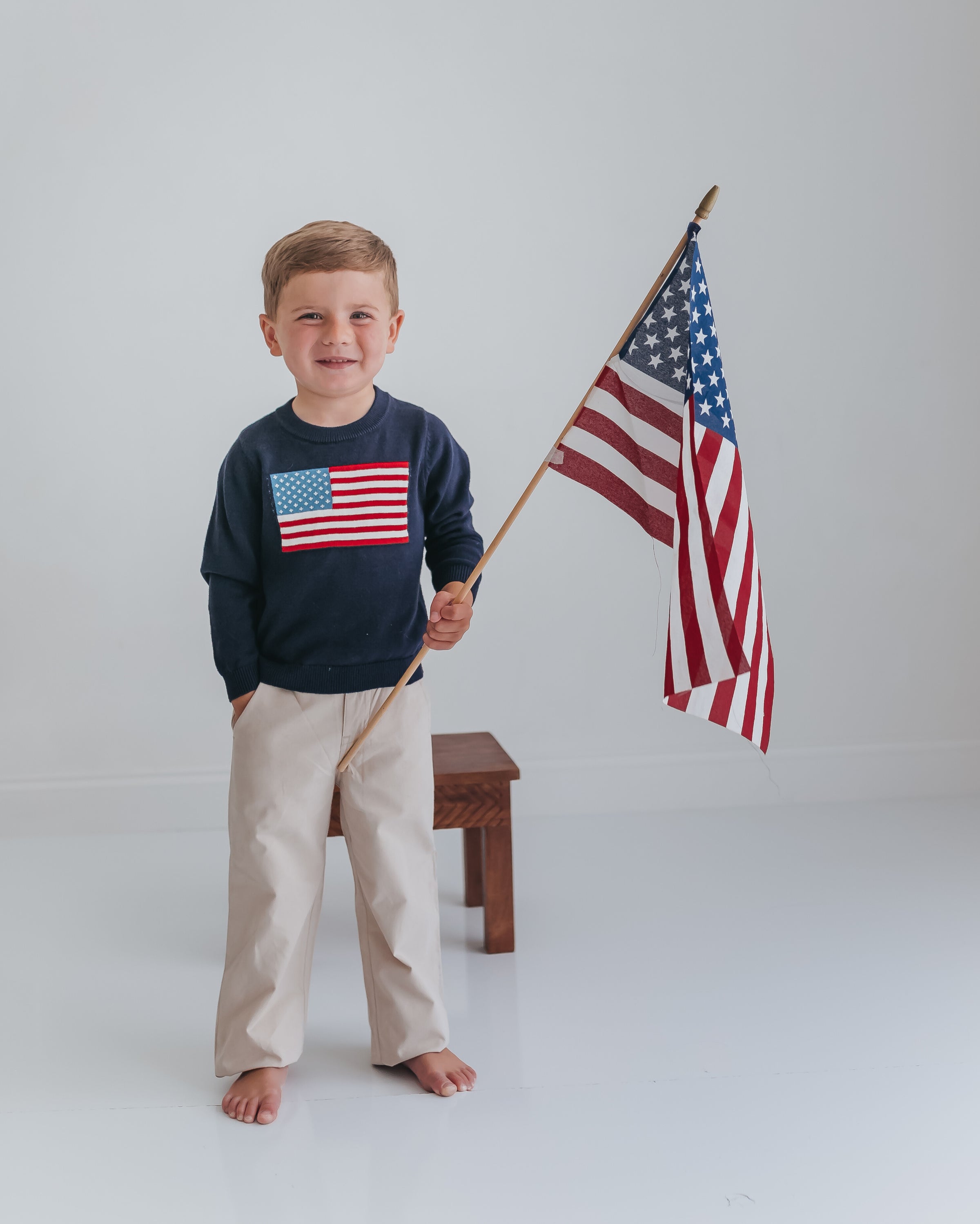 Let him show off his red, white, and cool in this all-American sweater! Featuring a bold USA flag design, this cozy knit is perfect for chilly days, backyard barbecues, fireworks, and everyday adventures. Soft, warm, and made to move, it’s the ultimate layer for little patriots who love to play hard and show their stars and stripes with pride. Great for 4th of July, family photos, or just repping the USA year-round.
